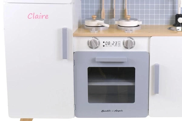 Personaliseer de wit-grijze XL Modern kinderkeuken met een naamsticker! Van welke chef is deze geweldige keuken? Je ontvangt een roze naamsticker die je zelf mag opplakken. Wil je de naam op de koelkast links? Op het kastje rechts? Of wat hoger op het vriezerdeurtje? Bepaal zelf waar de sticker wordt geplaatst. We drukken een naamsticker van maximaal 10 karakters.