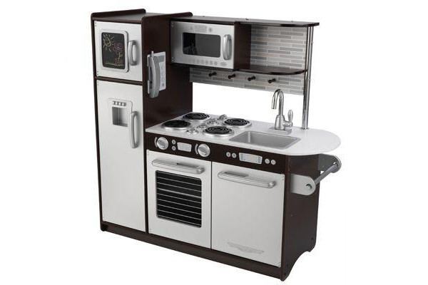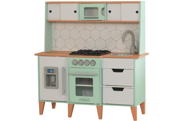 Prachtige houten Modern Countrykeuken van het merk Kidkraft. De kinderkeuken heeft mooie wit/roze kleuren en is voorzien van een oven, keuken kastjes, 2 pitten, een wasbak met kraan en magnetron. Verras je ouders en laat zien wat voor lekkers jij kunt koken.