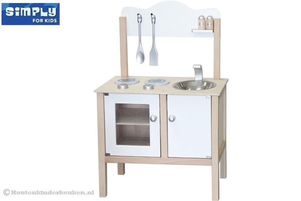 Met deze leuke houten kinderkeuken van Simply for kids maak jij gegarandeerd de heerlijkste gerechten klaar! Dat kan o.a. op het 2 pits gasfornuis maar ook in het oventje kun jij allerlei lekkere dingen bereiden. Tevens heeft het keukentje een kastje waarin je alles op kunt bergen en een kraan met een gootsteen. Maar dat is nog niet alles! Ook wordt er een peper en zoutstelletje en een pollepel en spatel bijleverd. Geschikt voor kinderen vanaf 2 jaar.